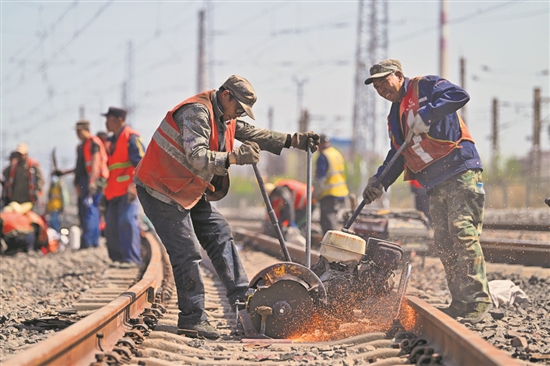 4月18日,中國鐵路太原局集團(tuán)有限公司大同工務(wù)段職工在進(jìn)行集中修施工作業(yè)。從4月1日起,能源運(yùn)輸大動(dòng)脈大秦鐵路開始為期30天的春季集中修施工,以全面提升線路設(shè)備設(shè)施質(zhì)量,為即將到來的迎峰度夏電煤保供夯實(shí)安全基礎(chǔ)。新華社記者 詹彥 攝