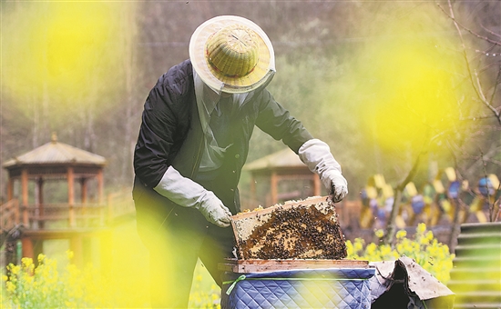 4月10日,神農架林區(qū)中蜂養(yǎng)殖實訓中心,工作人員查看蜂箱內蜜蜂狀態(tài)。