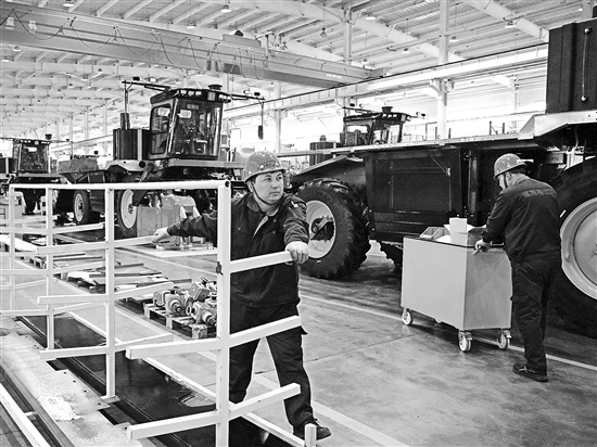 4月16日,新疆塔城地區(qū)烏蘇市缽施然智能農(nóng)機(jī)股份有限公司的采棉機(jī)生產(chǎn)車(chē)間進(jìn)入生產(chǎn)高峰,工人加緊轉(zhuǎn)運(yùn)所需零件,為秋季棉花采收做好準(zhǔn)備。新華社記者 張嘯誠(chéng) 攝