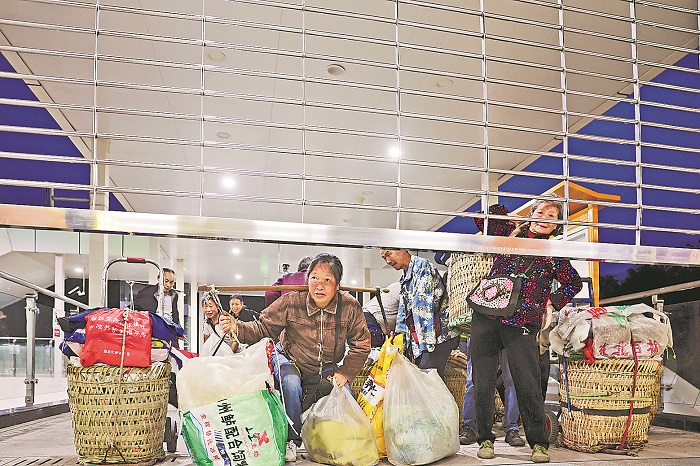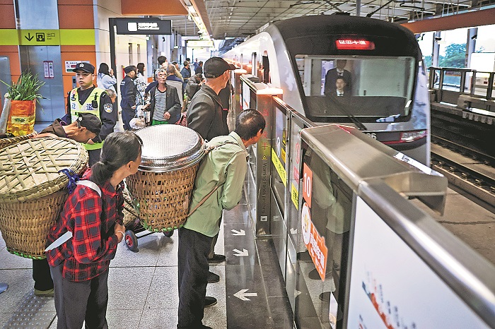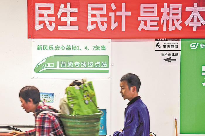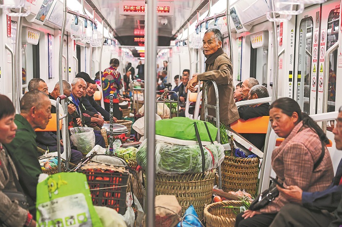 “以前只能在村里賣,有了地鐵之后,我們都能去城里賣了,價(jià)格能多賣一兩倍。我們都有公交卡,超過65歲就能免費(fèi)坐地鐵?!敝軕c蘭說,她的聲音里帶著自豪和滿足。經(jīng)過50多分鐘的跋涉,周慶蘭終于將30多斤的蔬菜背到了石船站。此時(shí),地鐵站入口處的菜農(nóng)已經(jīng)排起了長隊(duì)。