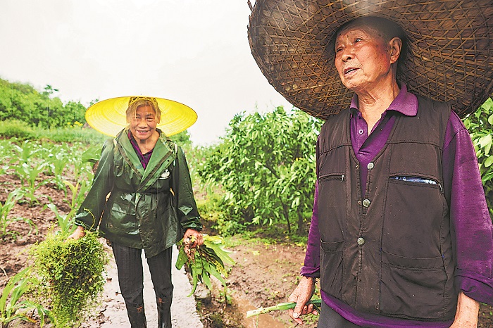 4月16日,重慶市渝北區(qū)石船鎮(zhèn)黃嶺村,村民周慶蘭(圖左)與老伴羅光華在雨中摘菜。