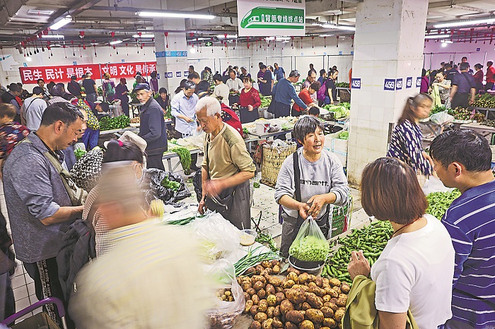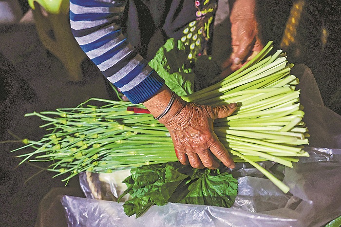 4月14日,重慶市江北區(qū)新民樂安心菜場,乘坐“背簍專線”前來的菜農(nóng)在售賣當(dāng)天的蔬菜。