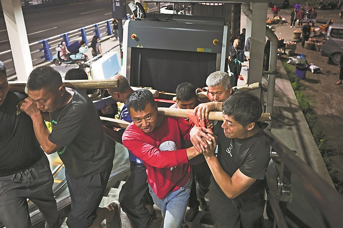 4月15日凌晨4時(shí),工人在石船站搬運(yùn)安檢設(shè)備。為讓菜農(nóng)更加安全高效地進(jìn)入車站,重慶地鐵四號線公司專門為該站調(diào)配了一臺大型落地安檢機(jī)。