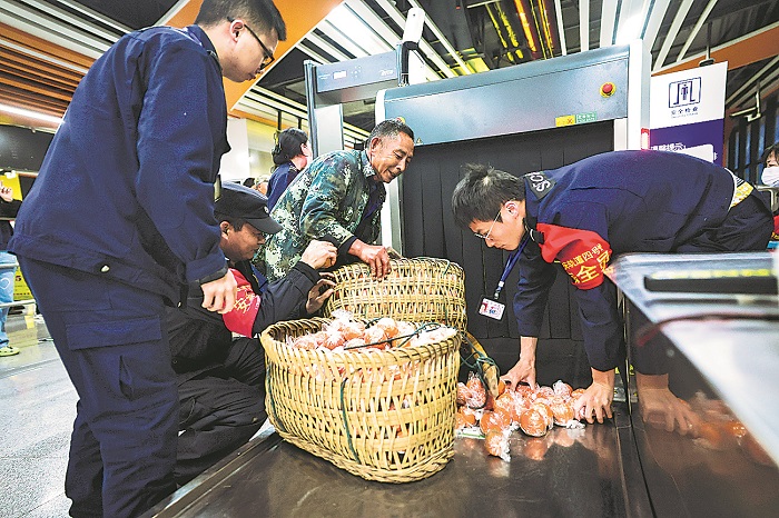 4月17日,重慶地鐵4號線石船站,工作人員幫助菜農(nóng)收拾散落在安檢機(jī)上的橙子。