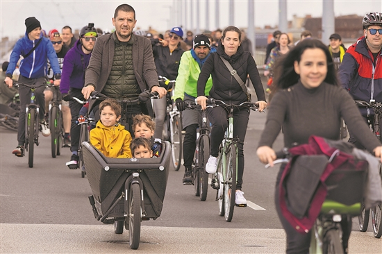 當(dāng)?shù)貢r間4月20日,在匈牙利首都布達佩斯,人們參加自行車騎行活動。當(dāng)日,匈牙利布達佩斯舉辦自行車騎行活動,倡導(dǎo)人們低碳出行,并迎接世界地球日的到來。今年4月22日是第55個世界地球日。新華社發(fā) (弗爾季·奧蒂洛 攝)