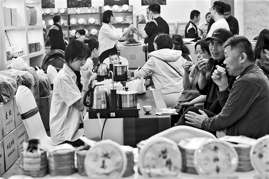 4月21日,在北京茶博會上,一名茶藝師(左一)和觀眾一起品茶。第十六屆北京國際茶業(yè)及茶藝博覽會于4月19日至22日在北京全國農(nóng)業(yè)展覽館舉辦。本屆茶博會匯聚700多家參展商,展出面積近2.4萬平方米。