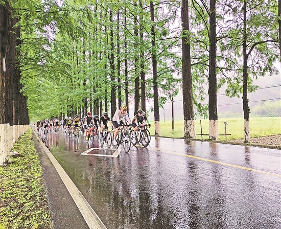 4月21日,錢江源公路自行車賽開化站開賽。作為此次騎行途經的桃下線是浙江開化縣城通往多個鄉(xiāng)鎮(zhèn)的交通要道。該縣于1980年在公路兩旁種植水杉,經過40多年的精心養(yǎng)護,水杉郁郁蔥蔥,側分的枝丫在空中盤繞形成一道拱門。人們穿行其間,就像進入了綠色世界。 徐曙光 余堅 攝