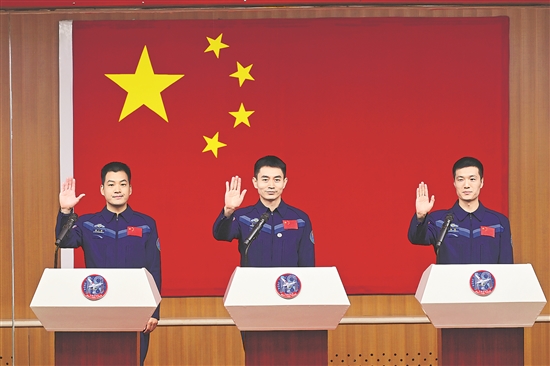 4月24日,神舟十八號(hào)載人飛行任務(wù)航天員葉光富(中)、李聰(右)、李廣蘇在酒泉衛(wèi)星發(fā)射中心問(wèn)天閣與媒體記者集體見(jiàn)面。