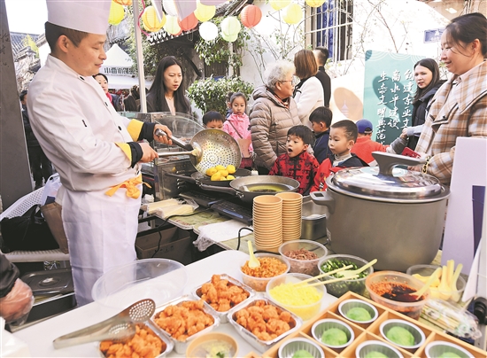 在浙江省湖州市小西街舉辦的新春市集上,“浙江工匠”蔡林榮(左)為人們制作當(dāng)?shù)靥厣〕约?xì)沙羊尾。