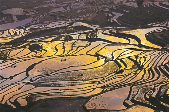 在云南哀牢山南部,世居在此地的哈尼人沿著山坡開墾梯田。梯田自河谷延伸到海拔2000多米的山上,每年春耕開始的時候,自山頂?shù)摹褒執(zhí)丁狈潘嘧⑻萏?。當太陽升起,萬畝梯田金波閃耀。本報通訊員 溫昀妍 攝