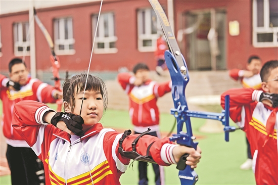 4月23日,在圍場縣第一小學(xué),學(xué)生在練習(xí)射箭。近年來,河北省圍場滿族蒙古族自治縣各學(xué)校將民族文化融入到日常教學(xué)中,通過開設(shè)射箭、滿繡、馬頭琴、太平鼓等多彩課堂,豐富校園文化生活,促進學(xué)生健康快樂成長。新華社發(fā)(王立群 攝)