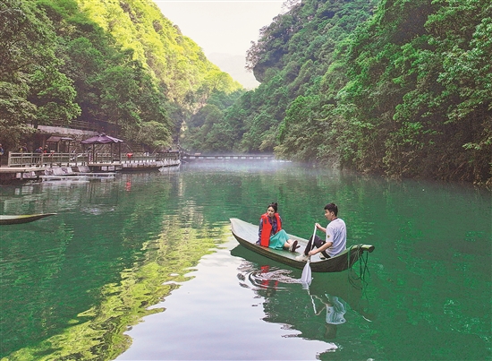 屏山旅游景區(qū)以水質(zhì)清澈聞名?!拔逡弧奔倨谂R近,屏山景區(qū)推出仿生“箬葉”船等新型游船,帶給游人漂浮于碧波之上的游覽體驗。
