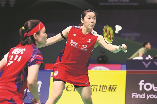 4月28日,中國(guó)隊(duì)組合陳清晨/賈一凡(右)在女雙比賽中。她們2比0戰(zhàn)勝加拿大隊(duì)組合杰基·登特/克里斯托·賴。當(dāng)日,在四川省成都市舉行的尤伯杯羽毛球賽A組比賽中,中國(guó)隊(duì)5比0戰(zhàn)勝加拿大隊(duì)。
