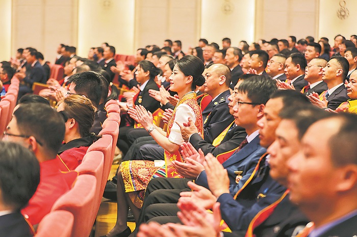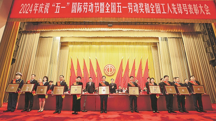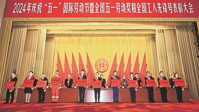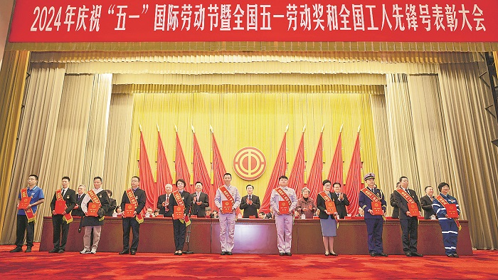 全國五一勞動(dòng)獎(jiǎng)?wù)芦@得者代表上臺(tái)領(lǐng)獎(jiǎng)。
