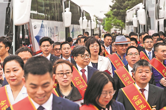 全國五一勞動(dòng)獎(jiǎng)狀獲獎(jiǎng)單位代表上臺(tái)領(lǐng)獎(jiǎng)。