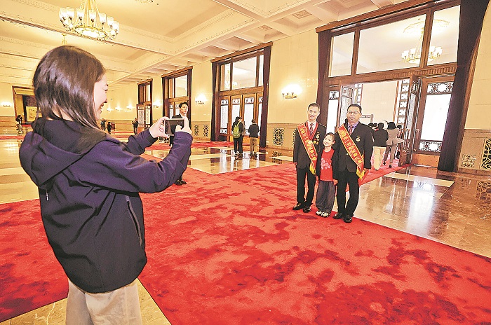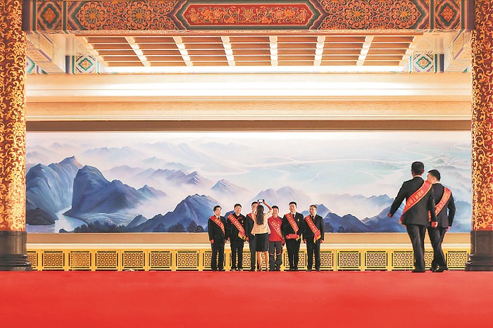 表彰大會(huì)開始前,獲獎(jiǎng)代表們?cè)诒本┤嗣翊髸?huì)堂里的《長江萬里圖》前合影。