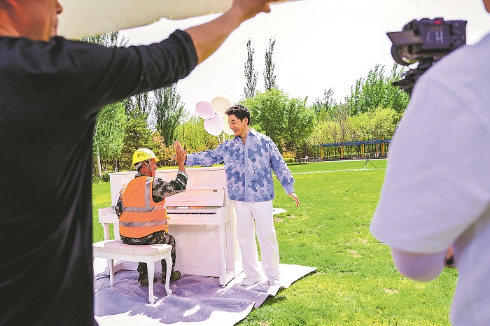 4月18日,央視總臺(tái)在中關(guān)村軟件園內(nèi)的一處草坪上錄制2024年“中國夢·勞動(dòng)美”慶?!拔逡弧眹H勞動(dòng)節(jié)心連心特別節(jié)目,來自深圳的建筑工人易群林應(yīng)邀與知名歌手任賢齊搭檔演出。