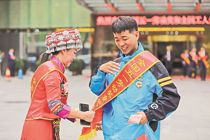 中國職工之家門口,今年的全國五一勞動(dòng)獎(jiǎng)?wù)芦@得者粟瓊(圖左)幫助另一位獲獎(jiǎng)?wù)吆槌赡菊砭R帶。