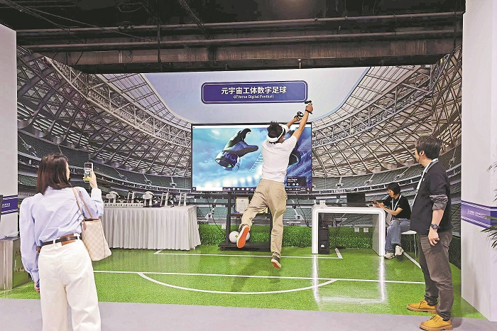 日前,在中關(guān)村論壇新聞中心元宇宙工體數(shù)字足球體驗區(qū),體驗者佩戴VR頭顯,體驗“點球大戰(zhàn)”。