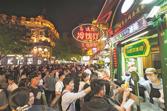 5月3日,游客在哈爾濱中央大街上的馬迭爾冷飲廳購(gòu)買冰棍。
