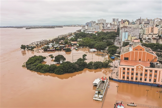 這是近日在巴西南里奧格蘭德州阿雷格里港拍攝的被洪水淹沒的街道和建筑。巴西南部南里奧格蘭德州政府近日通報,暴雨及其引發(fā)的洪災在當?shù)匾言斐蓴?shù)十人死亡。新華社/巴西通訊社