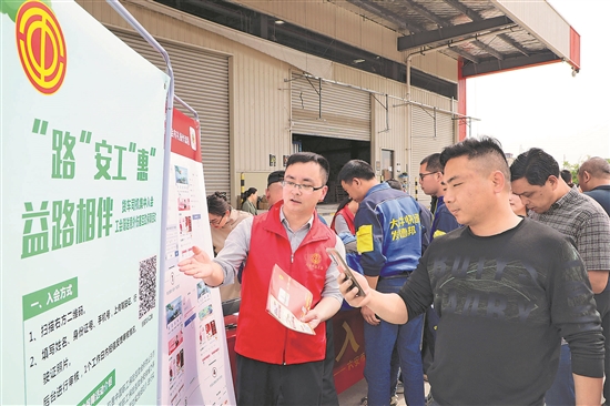5月6日,在安徽省六安傳化物流園,工會志愿者引導貨車司機現(xiàn)場掃碼入會。