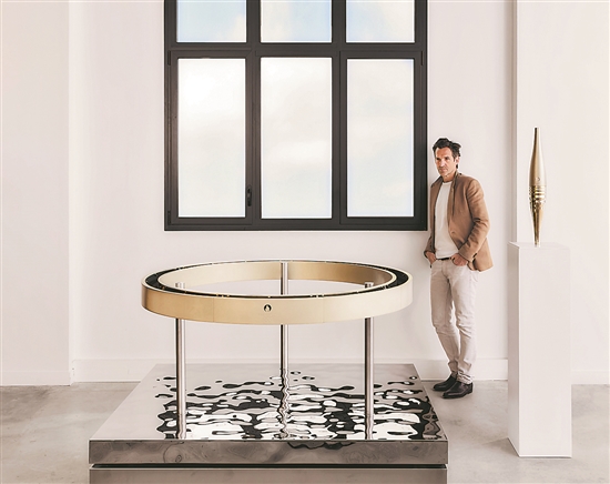當(dāng)?shù)貢r(shí)間5月6日,巴黎奧組委正式公布了奧運(yùn)及殘奧火炬接力火種臺(tái)的設(shè)計(jì)方案,該火種臺(tái)由設(shè)計(jì)了巴黎奧運(yùn)火炬的法國(guó)著名設(shè)計(jì)師馬修·勒漢紐爾操刀完成,實(shí)物形象上與奧運(yùn)火炬也高度融合;同時(shí)還公布了給每位火炬手的紀(jì)念品——名為“火炬之心”的圓環(huán)。這是設(shè)計(jì)師馬修·勒漢紐爾與火種臺(tái)合影。新華社發(fā)