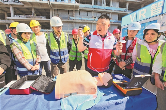 5月8日,江蘇省徐州市鼓樓區(qū)一建筑工地,急救培訓(xùn)教員向工人講解自動(dòng)體外除擅儀使用方法。