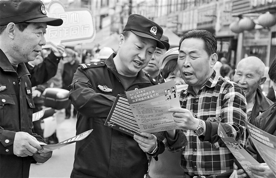 5月6日,江蘇省海安市公安局墩頭派出所利用農(nóng)村傳統(tǒng)“趕集日”,向趕集群眾宣傳防范電信網(wǎng)絡(luò)詐騙和養(yǎng)老詐騙知識(shí),提高群眾識(shí)騙防騙能力。周強(qiáng) 攝/中新社