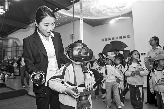 近日,在浙江省湖州市南潯區(qū)人民法院道德法治教育實(shí)踐基地,小學(xué)生們正在通過VR眼鏡進(jìn)入虛擬法治展館,通過交互技術(shù)了解法律條文,身臨其境地體驗(yàn)沉浸式的普法教育。陸志鵬 攝/中新社