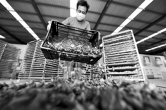 5月9日,在河北省衡水市阜城縣張家莊村玫瑰種植基地,花農(nóng)在初篩玫瑰花蕾。