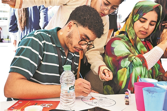 近日,摩洛哥國(guó)立拉巴特高等礦業(yè)學(xué)校舉行第20屆世界文化節(jié)活動(dòng),剪窗花、繪臉譜、解魯班鎖等富有中國(guó)特色的體驗(yàn)活動(dòng)讓當(dāng)?shù)厍嗄旮惺艿搅酥袊?guó)文化的獨(dú)特魅力。圖為近日,在摩洛哥首都拉巴特,摩洛哥青年學(xué)生體驗(yàn)繪臉譜。