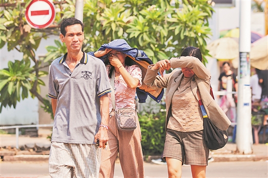 近期,熱浪席卷東南亞和南亞大片地區(qū),老撾也遭遇高溫酷暑侵襲,最高氣溫超40攝氏度,給民眾正常生產(chǎn)生活帶來影響。圖為近日,人們走在老撾首都萬象街道上時用衣物遮蔽自己。