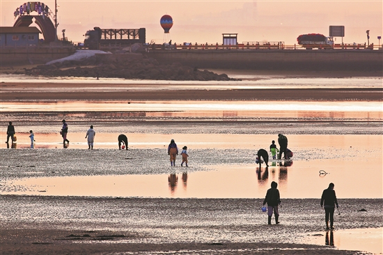 近日,山東省日照市,游客們迎著初升的太陽趕海拾貝的身影,與金色的海面、遠(yuǎn)處的港口、行駛漁船交相輝映,構(gòu)成了一幅幅美不勝收的海上生態(tài)畫卷。鄭培波 攝/視覺中國