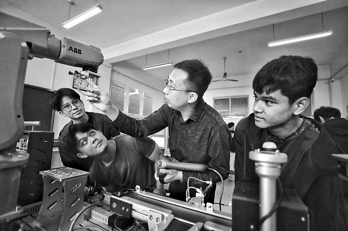 5月10日,在山東萊蕪職業(yè)技術(shù)學(xué)院智能制造系的自動(dòng)化教室,全國(guó)青年崗位能手、齊魯首席技師賈川(右二)老師正耐心指導(dǎo)來自泰國(guó)的留學(xué)生規(guī)范操作工業(yè)機(jī)器人。隨著共建“一帶一路”倡議的深入實(shí)施,越來越多“走出去”企業(yè)迫切需要大量?jī)?yōu)秀人才。