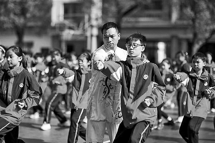 雷超(中)在黃梅縣第一小學教授岳家拳。石勛 攝
