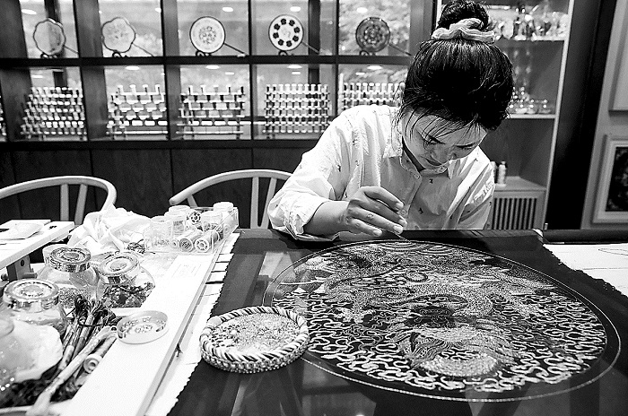“之前在互聯(lián)網(wǎng)工作,我就想了一個‘黃梅+’的模式”,就是將黃梅挑花和現(xiàn)代元素結(jié)合,比如將挑花作為裝飾做成墻面、燈罩、匾額等等。不久前就有顧客找到她,定制挑花的窗簾。“有點像‘高定’了”,她戲言。