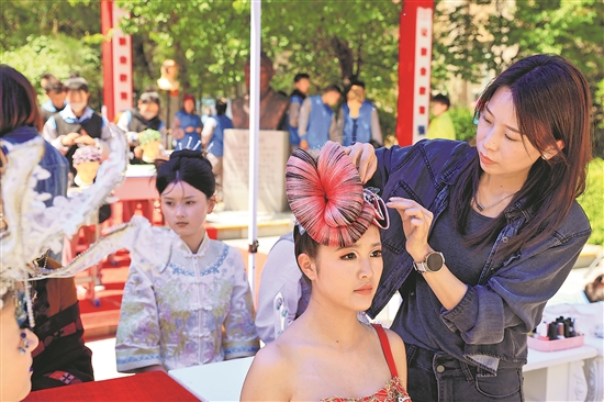 5月14日,在青海省西寧市世紀(jì)職業(yè)技術(shù)學(xué)校,老師為學(xué)生整理展示妝容。