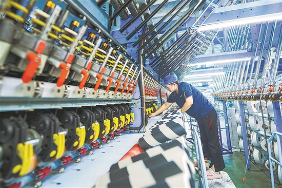 5月14日,在江蘇省宿遷市宿城區(qū)一家紡織企業(yè)生產(chǎn)車(chē)間里,工人在智能化生產(chǎn)線(xiàn)上趕制訂單產(chǎn)品。