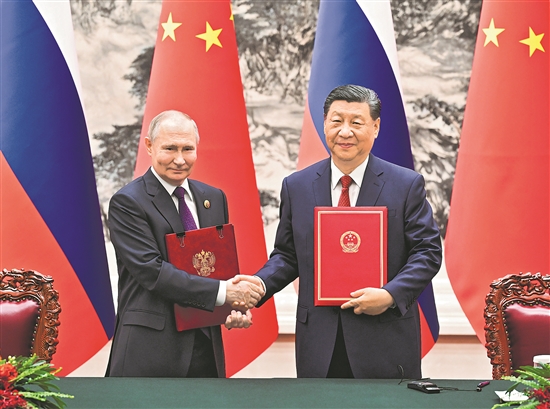 會談后,兩國元首共同簽署并發(fā)表《中華人民共和國和俄羅斯聯(lián)邦在兩國建交75周年之際關于深化新時代全面戰(zhàn)略協(xié)作伙伴關系的聯(lián)合聲明》,并共同見證簽署經(jīng)貿(mào)、自然保護、檢驗檢疫、媒體等領域多項雙邊合作文件。