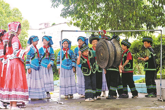 5月17日,貴州省黔西市鐘山鎮(zhèn)治中小學(xué)的布依族教師,在課間教孩子們打擊布依族銅鼓。近年來,該小學(xué)把當(dāng)?shù)氐牟家雷邈~鼓打擊文化引進校園,豐富校園文化生活,弘揚和傳承民族優(yōu)秀傳統(tǒng)文化。本報通訊員 周訓(xùn)超 攝