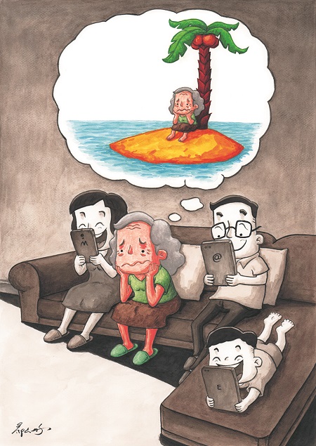 看過這幅作品,有人想笑,有人想哭,也有人啼笑皆非。對照自身和周圍的世界,我們能夠理解空巢老人的不易,我們每天都在見證低頭族正在經(jīng)歷什么樣的人生。漫畫《孤獨(dú)》用藝術(shù)化的語言闡釋了老人的遭遇:她的這場經(jīng)歷,如同口渴多日的人,眼前出現(xiàn)三瓶飲料,然而還來不及興奮,就發(fā)現(xiàn)哪一瓶都喝不到嘴里。這是怎樣的難忍和無奈?