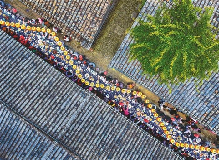 5月19日,游客在浙江省寧波市寧??h前童古鎮(zhèn)品嘗長桌宴。當(dāng)日是第14個“中國旅游日”,今年活動的主題是“暢游中國,幸福生活”。