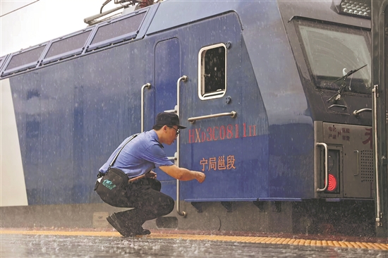 5月19日,廣西部分地區(qū)雨勢強(qiáng)勁,南寧、欽州、防城港均出現(xiàn)了特大暴雨,中國鐵路南寧局集團(tuán)有限公司南寧車輛段車輛乘務(wù)員在站臺與車廂里來回穿梭,在發(fā)電車?yán)锸刈o(hù)列車“心臟”,為旅客平安出行保駕護(hù)航。圖為該段車輛乘務(wù)員在南寧站站臺檢查機(jī)車與車體連掛狀態(tài)。廖炳達(dá) 攝
