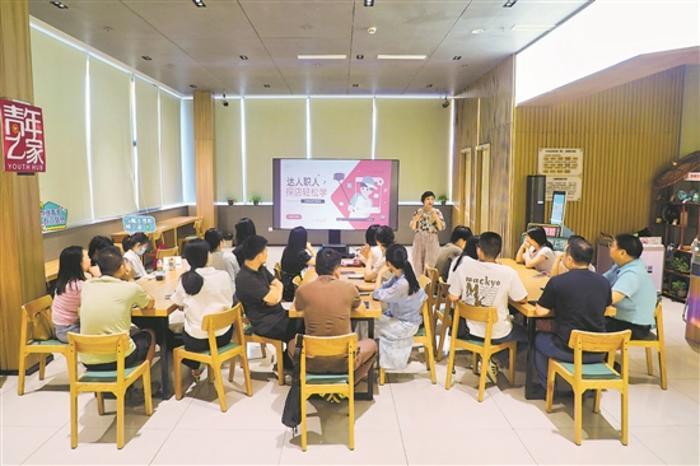 5月21日,在四川省瀘州市龍馬潭區(qū)這有光青年街區(qū)內(nèi),青年群體在青年夜校進(jìn)行“短視頻創(chuàng)作運營”學(xué)習(xí)。近年來,當(dāng)?shù)靥剿髑嗄暌剐?“理論”“文化”“才藝”“社交”“技能”等模式,持續(xù)為青年群體充電賦能。本報通訊員 楊尚威 攝