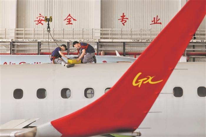 5月22日,在山東省日照市東港區(qū)日照山太飛機(jī)工程股份有限公司高標(biāo)準(zhǔn)機(jī)庫(kù)內(nèi),工作人員對(duì)飛機(jī)進(jìn)行檢修。