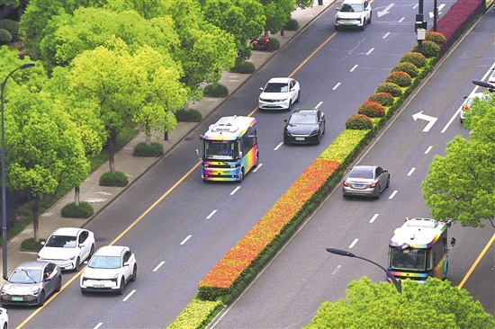 5月22日,自動駕駛接駁示范線巴士行駛在浙江省杭州市余杭區(qū)未來科技城的道路上。