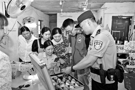 5月20日,在安徽省阜陽市阜南縣鹿城鎮(zhèn)一微型企業(yè)生產(chǎn)車間內(nèi),駱寨社區(qū)文明實踐站工作人員和民警利用仿真毒品模具,向女工們講解如何辨別毒品。本報通訊員 呂乃明 攝