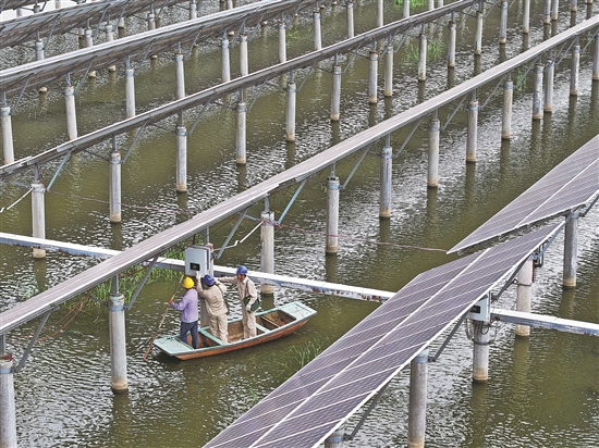 江蘇省揚州市圍繞綠色、節(jié)能、低碳,大力發(fā)展“風光漁”互補產業(yè)發(fā)電、風力發(fā)電,形成上有風力發(fā)電、中有光伏利用、下有水產品養(yǎng)殖和稻田的立體開發(fā)模式。同時,在當?shù)禺a業(yè)園廠房頂部加裝太陽能電池板,供給工業(yè)用電,通過清潔能源,不斷推動綠色發(fā)展。