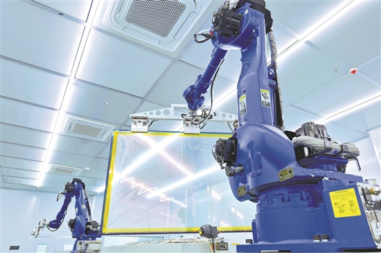 5月22日,江西省贛州市安遠縣產(chǎn)城新區(qū)的一家光電科技有限公司智能化生產(chǎn)車間內(nèi),一排排智能機器人正轉(zhuǎn)動機械臂加工透明導(dǎo)電膜。